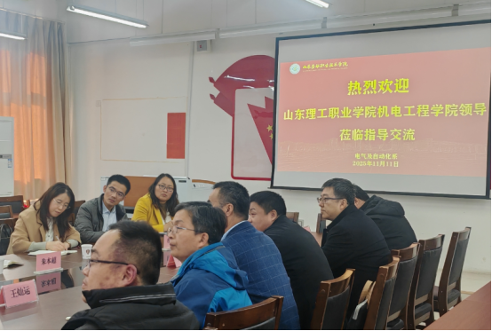 11月11日,山东理工职业学院机电工程学院院长王素梅一行5人来院考察交流,电气及自动化系接待来访客人。系主任尹四倍、副主任王灿运、郝涛,系党总支副书记杨振虎参加交流座谈活动,活动由电气及自动化系党总支书记赵秋叶主持。
