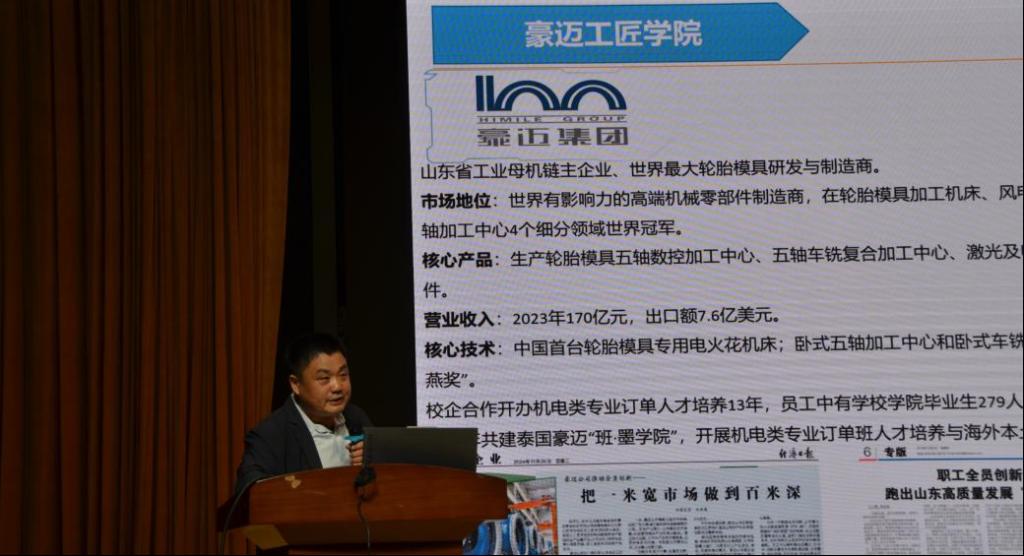 在宣讲会致辞中,尹四倍主任深入阐述了工业母机的战略地位及相关政策规划,并指出,面对产业人才缺口,学院依托七十年办学积淀与“三国五化一朵云”的专业群体系,与豪迈集团携手打造“豪迈匠才班”。他回顾了校企合作成果,并寄语学生借此订单班平台实现人生价值,为服务区域经济与国家供应链自主可控贡献力量。