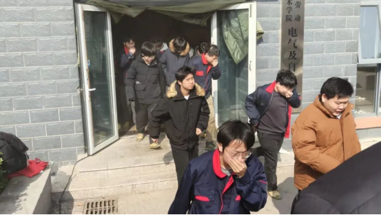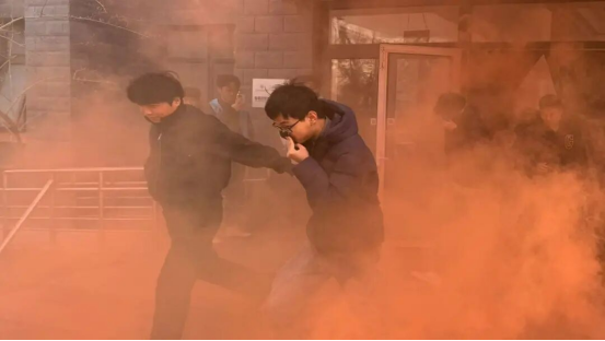 本次演练坚持"实战化"标准,现场启用消防声光报警系统模拟火情警报,并通过燃放发烟弹还原真实火灾现场环境。随着警报响起,参演师生迅速反应,按照预定疏散路线,弯腰低姿、捂住口鼻,快速有序撤离至安全集合地点。整个疏散过程紧张有序,达到了预期效果。